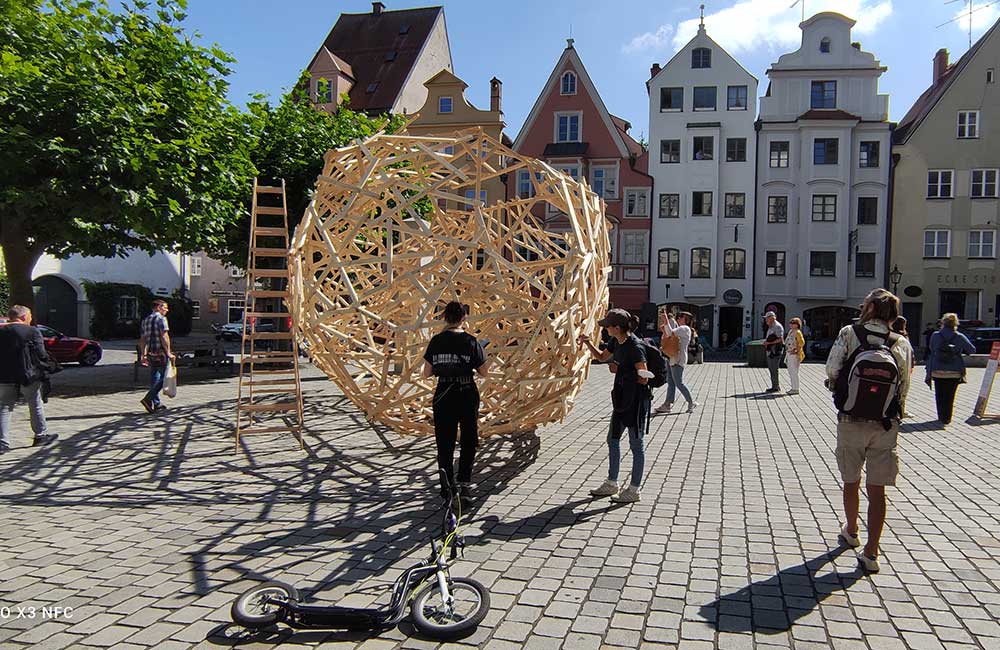 In Augsburg hat sich Steinert für sein Kunstwerk aus Holz den Platz hinter dem Rathaus ausgesucht. Der heißt nach dem berühmten Augsburger Baumeister Elias Holl. Drei Wochen lang baut Steinert im Sommer an seinem Objekt in Augsburg, bis es fertig ist. Die Skulptur mit 1800 Latten ist rund 15 Meter lang, 5 Meter hoch und 4 Meter breit. Dazu benötigt er ungefähr 5000 Schrauben aus Stahl. Er dreht sie mit einem Akkuschrauber immer durch zwei oder drei Latten, damit sie zusammenhalten. Jede Latte aus Fichtenholz ist 1 Meter lang.