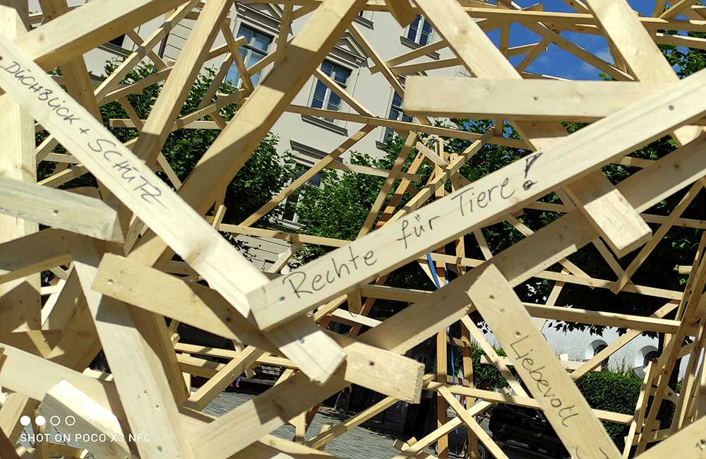 Das zusammengeschraubte Objekt heißt „A Shell Of a Nut“, also Schale einer Nuss. Die staunenden Besucherinnen und Besucher können überall hindurchsehen. Normalerweise dürfen Kunstwerke nicht berührt werden. Das ist bei Steinerts Holz-Objekten völlig anders. Er wünscht sich, dass sein Kunstwerk berührt wird und auch beschriftet. Viele Menschen in Augsburg haben schon ihre Wünsche und Hoffnungen auf eine der Holzlatten mit einem schwarzen Filzstift geschrieben, den der Künstler gerne dafür ausleiht. So können wir schöne Sätze lesen: „Glück und Gesundheit fürs Murmeltier“, „Endlich Kinderrechte ins Grundgesetz“, „Guten Abend, gute Nacht für ALLE“ oder „Make Love Not War“. Das passt natürlich zur Friedensstadt Augsburg bestens.